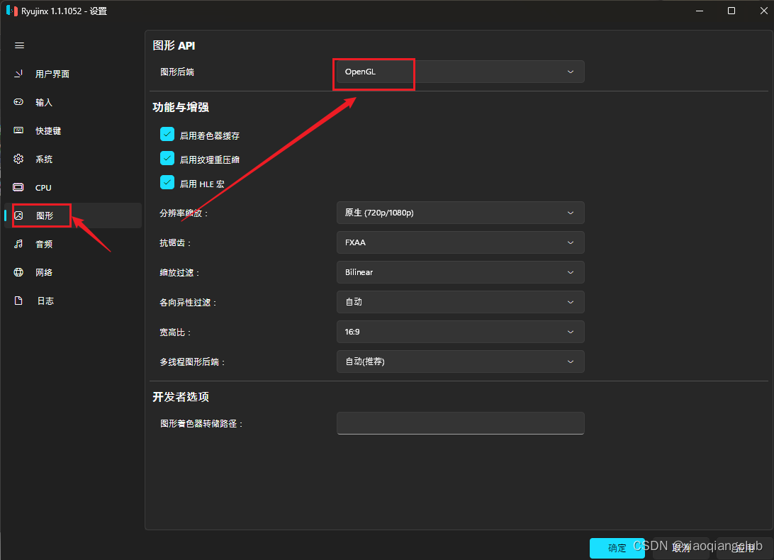 选项—>设置—>图形—>图形后端—>OpenGL—>确定,如图