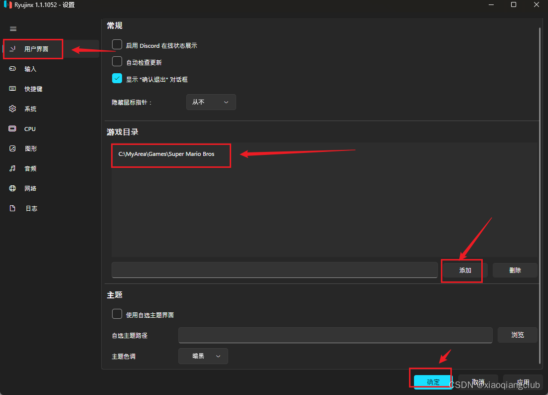 选项—>设置—>用户界面—>游戏目录—>添加 Super Mario Bros 目录—>确定,如图