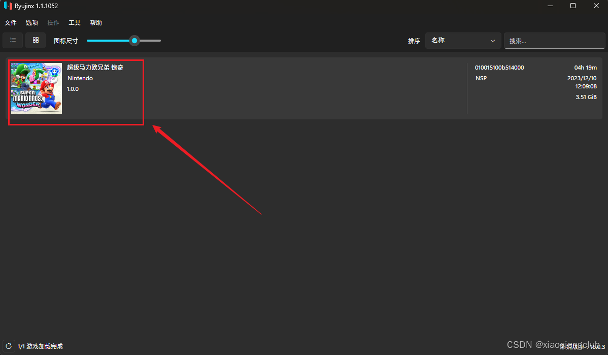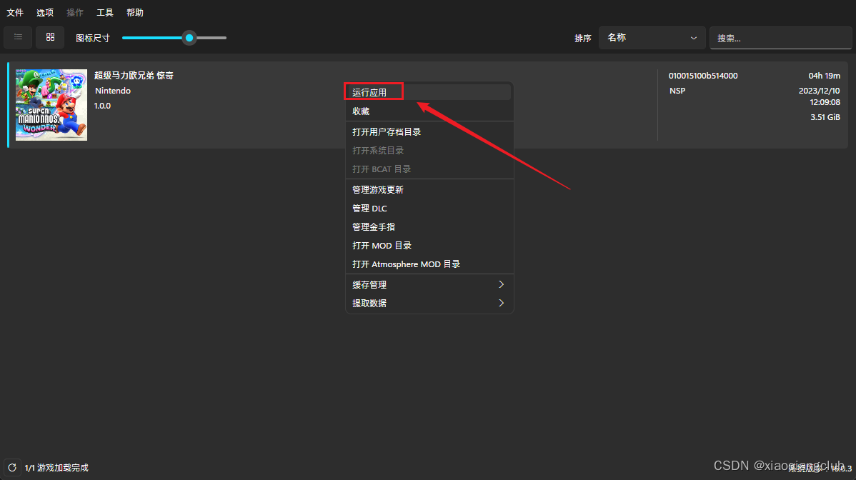文件—>加载文件—>Super Mario Bros. Wonder [010015100B514000][v0].nsp—>确定,但是这种方式需要每次都这样添加一遍游戏[不推荐],如图